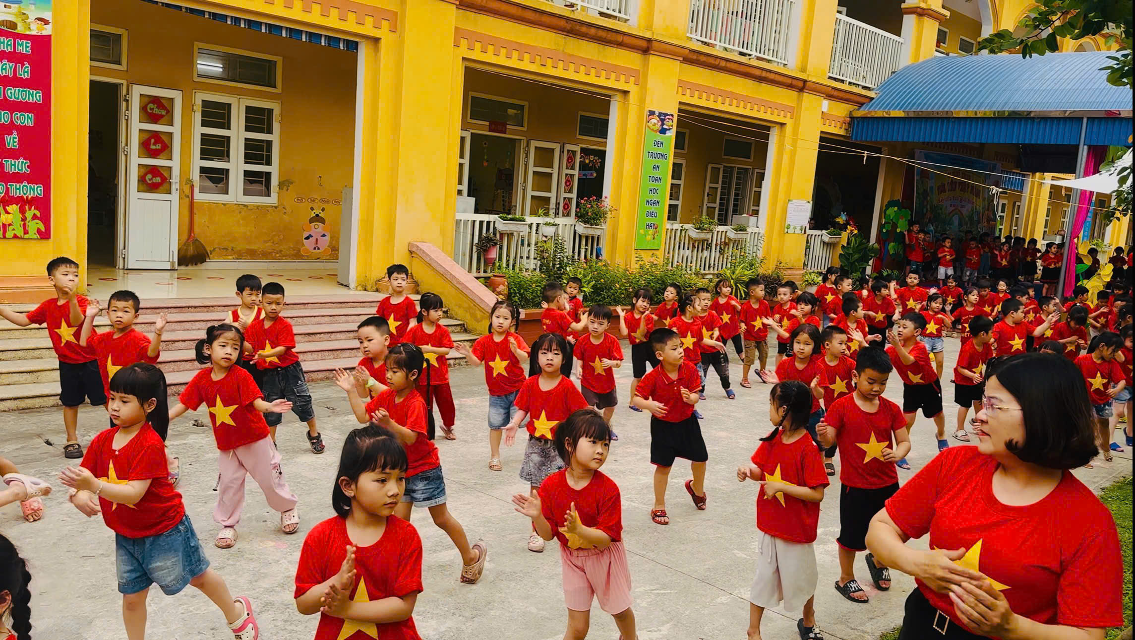(Màn đồng diễn của học sinh toàn trường)