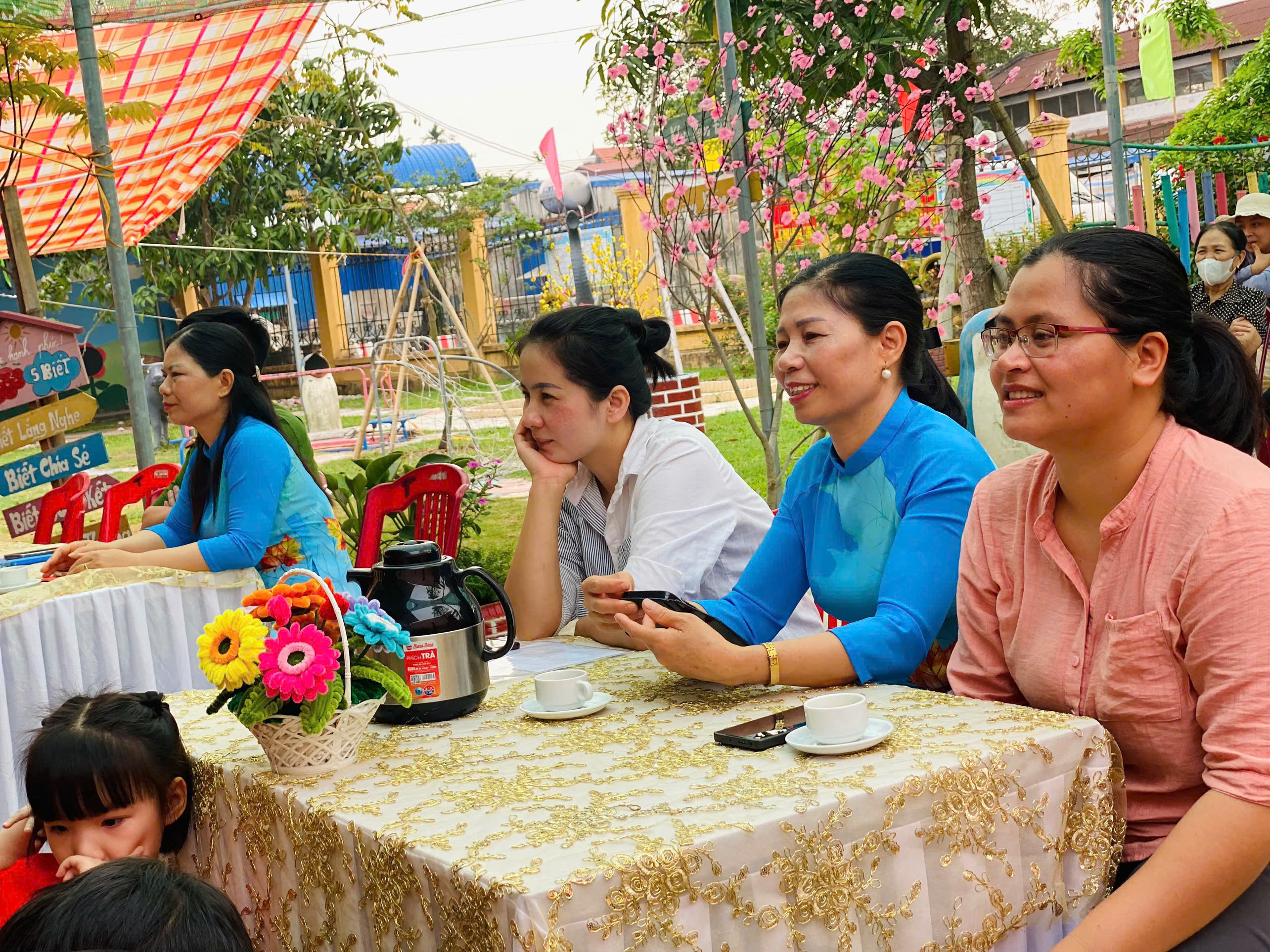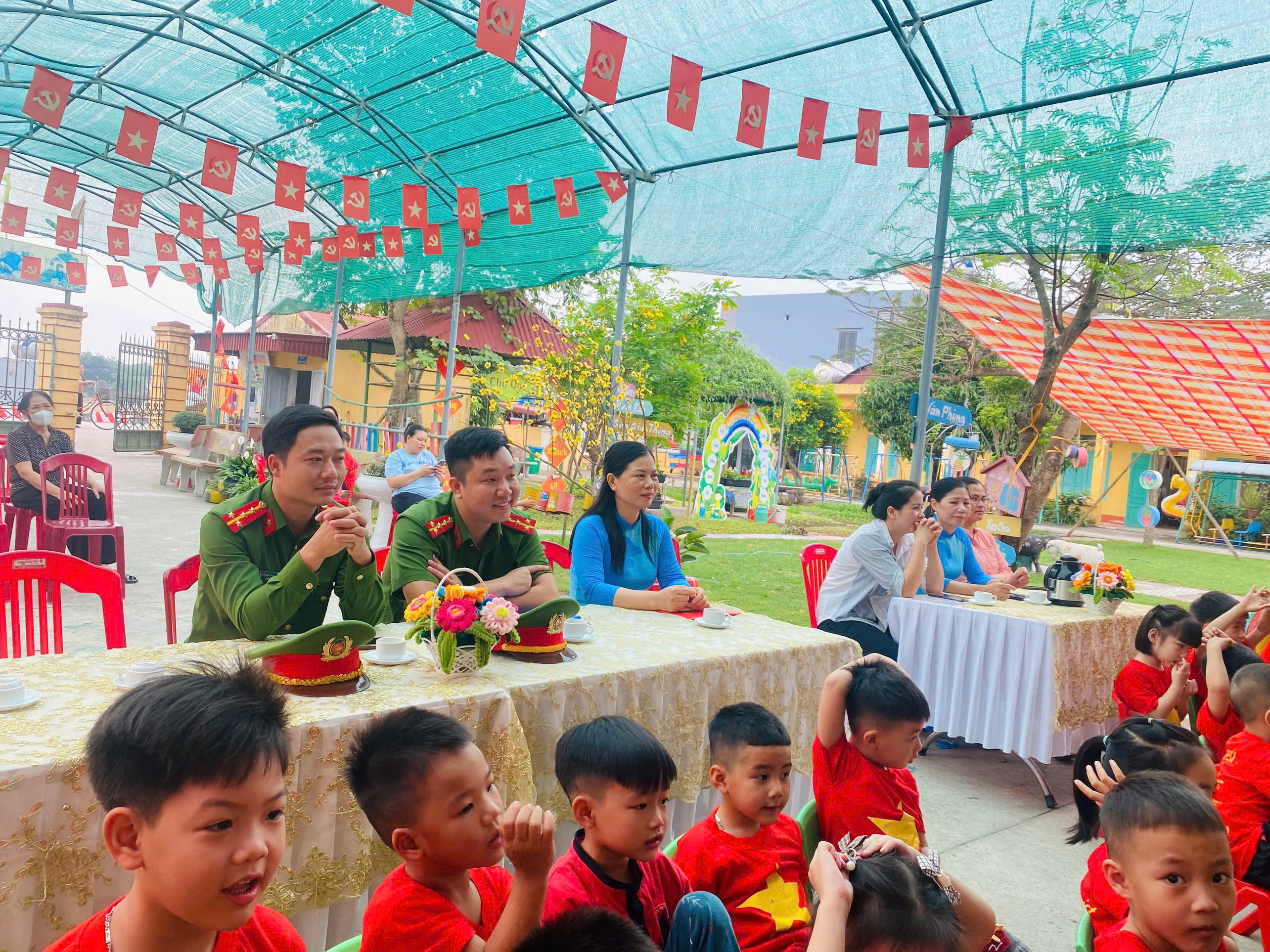 Tham dự và chung vui cùng chương trình, nhà trường vinh dự được đón tiếp các đồng chí: Hoàng Mạnh Vương, Đặng Hà Phan – cán bộ Công an xã Ninh Giang; đại diện Ban đại diện cha mẹ học sinh cùng toàn thể cán bộ, giáo viên, nhân viên nhà trường. Sự hiện diện của các đại biểu thể hiện sự quan tâm sâu sắc và sự phối hợp chặt chẽ giữa gia đình – nhà trường – xã hội trong công tác chăm sóc, giáo dục trẻ em.